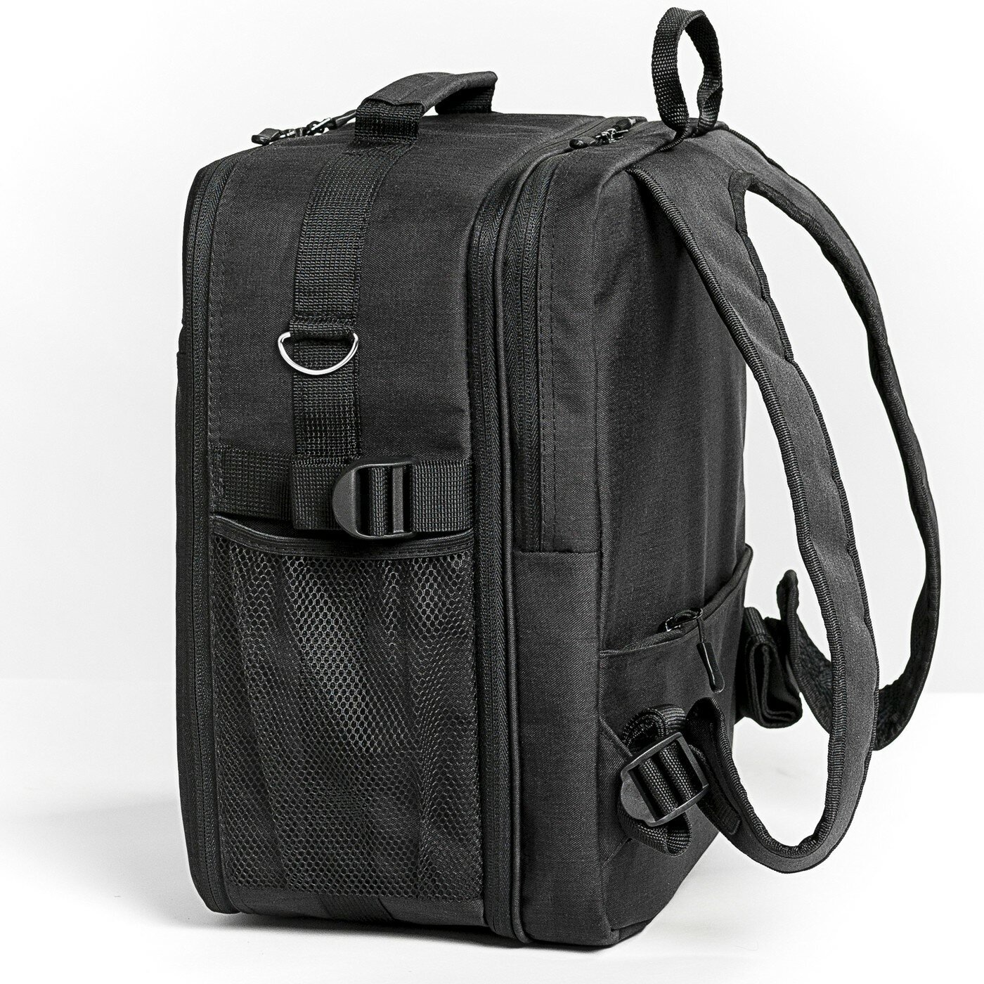 Модель рюкзака трансформера сшита под размеры калибратора 36х30х27 В данной модели есть ряд улучшений для удобства его использования.- анатомические плечевые ремни, что делает ношение рюкзака более удобным. так же правильное распределение нагрузки, что делает более долговечным данное крепление ремней- дополнительный сетчатый карман сбоку для использования под воду или термос- задний карман для безопасности хранения документов, а так же для удобства их оперативного использования- дополнительные отделения на передней стенке рюкзака для удобства распределения гаджетов, проводов для зарядки и всяких мелочей- в данной модели есть внутренняя подкладка- боковые утяжки для возможности крепления какого либо оборудования или вещей для путешествия ( (штатив, плед, палки для скандинавской ходьбы)- вшиты дополнительные уплотнители в боковые и переднюю стенку рюкзака, что позволяет сохранять хрупкие вещи в целости.- дополнительная ручка для возможности вешать рюкзак.Так же с данным рюкзаком возможно использовать вставку Safebox, что позволяет сделать из него полноценный рюкзак для фото аппаратуры, каких либо гаджетов или если перевозится что-то хрупкое. Глубина рюкзака уменьшается круговой молнией до 20см для комфортного использования между перелетами. Есть внешний карман, закрывающийся на молнию, отделение для ноутбука до 15" и дополнительный внутренний карман. Произведен из прочной ткани с водостойкой пропиткой. Стойкий к загрязнению, истиранию и другим внешним воздействиям. Универсальный рюкзак, удобный в полетах и повседневной носке. Компактно складывается, не занимая много места.