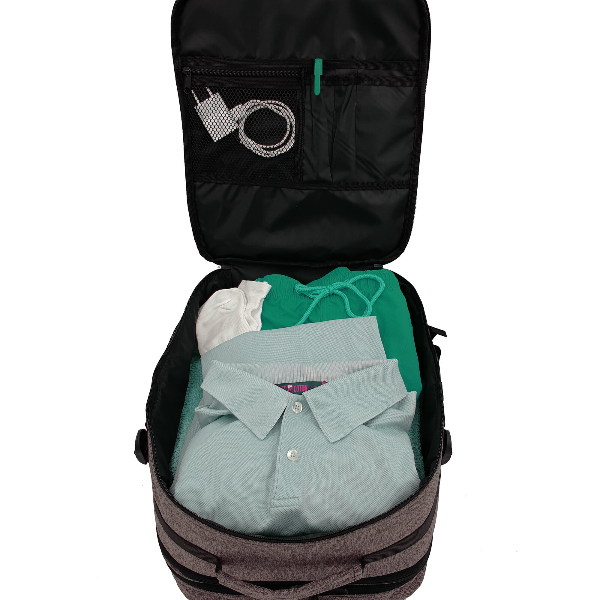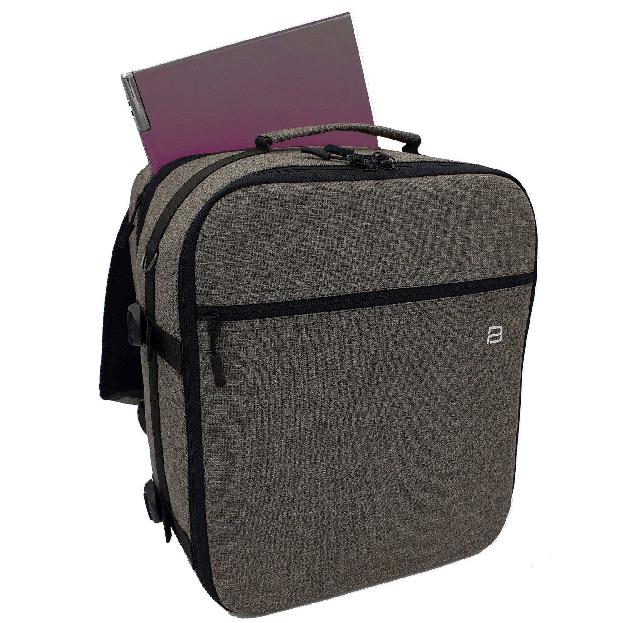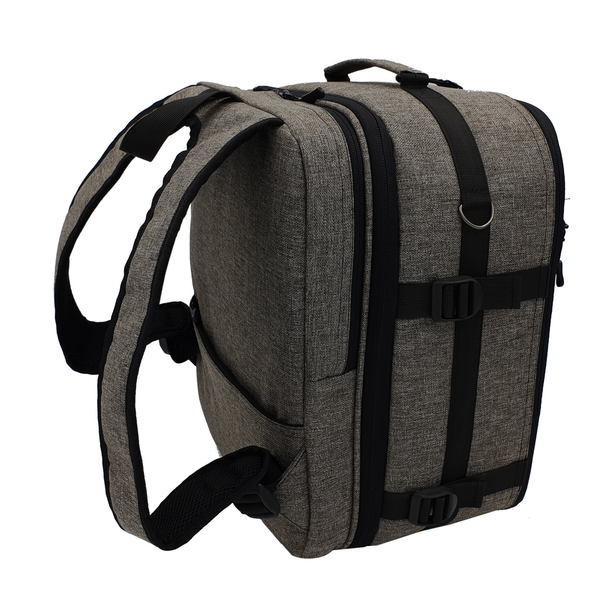 Глубина рюкзака уменьшается круговой молнией до 20см для комфортного использования между перелетами. Есть внешний карман, закрывающийся на молнию, отделение для ноутбука до 15" и дополнительный внутренний карман.
