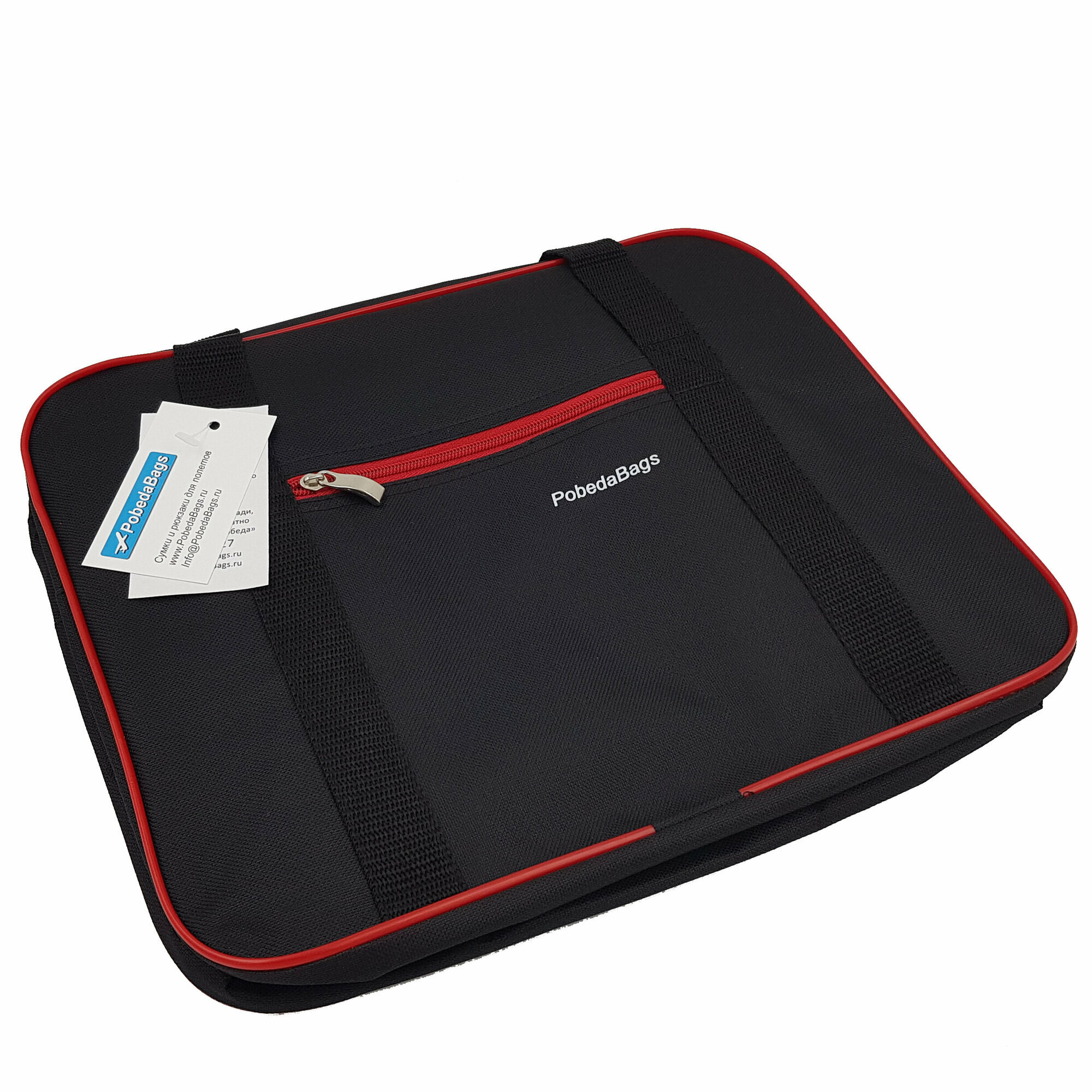 Универсальна, удобна в переноске и эксплуатации. Компактно складывается, не занимая много места.,Черная сумка для ручной клади авиакомпании "Победа"* с красным кантом.
